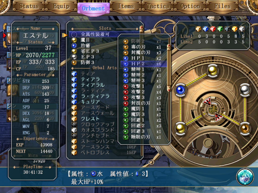 Shown on the image's right side, each character has a different arrangement of slots and 'lines'. Each Quartz has a different point value of the seven elements, and the values are added up for each line, allowing that character to use Orbal Arts . While the different combination of any Quartz can provide different Arts, they also physically enhance their status parameters.